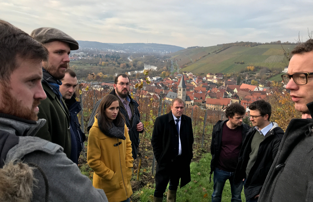 Randersacker (ju) Pragmatisch-nachhaltig – unter diesem Motto tagte der Arbeitskreis für Umwelt, Landwirtschaft und Forsten, der Jungen Union Unterfranken Ende November in Randersacker. Nach morgendlicher Diskussionsrunde mit CSU-Umweltpolitikerin Barbara Becker ging es zum Ortstermin in den Weinberg. Hier gaben die jungen Winzer Thomas Schenk, Lothar Schmitt und Martin Göbel dem Arbeitskreis sowie CSU-Landratskandidat Thomas Eberth, Markträtin Johanna Schmitt und die JU-Kreisvorsitzenden Julian Heim (WÜ) und Sabrina Stemplowski (KT) einen Einblick in die Problematik der zunehmenden Wildschäden im Weinbau.