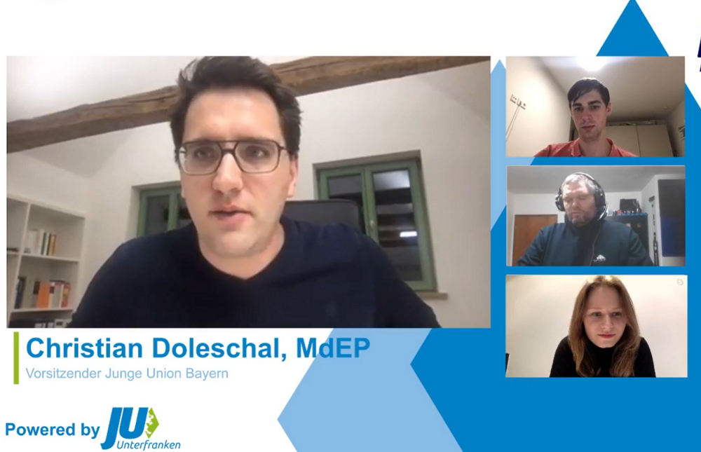 Auf Einladung der Jungen Union Unterfranken diskutierte Doleschal Mitte Februar im von Christina Henke (AB) moderierten Livestream mit Startuper Erik Kaiser (Spin-Off der TU Darmstadt ArgumenText) und dem CSIO des in Franken zum globalen Hidden-Champion gewachsenen Clouddienstleister owncloud Christian Schmitz darüber, wie Digitalpolitik aus junger Sicht zukunftsfähig gestaltet werden kann. „Die unterfränkischen Digitalministerinnen machen in Land und Bund einen guten Job, weil sie Themen ansprechen und auf Umsetzung drängen“, lobte der Europapolitiker, stellte aber auch kritisch fest: „Ressortprinzip-Denken ist in die digitale Zeit nicht zu übersetzen. Es braucht ein anderes Mindset und mehr Kompetenzen beim Digitalministerium!“